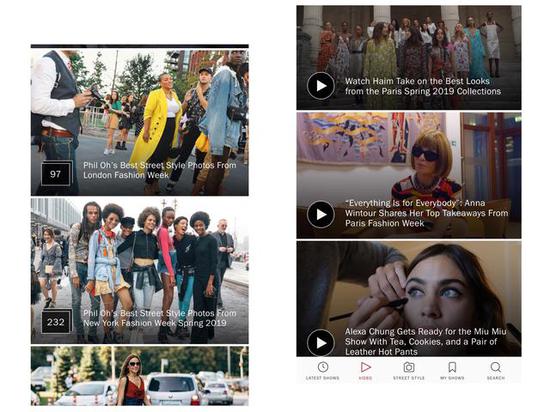 作为时尚领袖 vogue 旗下的分支,Vogue Runway 的 app 里同样能看到最新秀场、幕后视频、时尚街拍等等,用清晰的分类进行全方位的时尚展示。