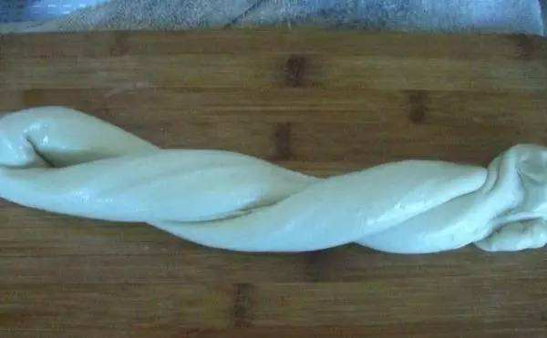 3然后双手拉起面剂,拉长后顺势扭结,就这样反复拉,这叫溜面,这个过程大约得10分钟