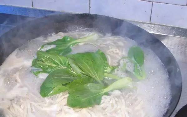 11把面拉成细条,粗细根据自己喜好,入锅煮,待面飘浮起来,放一点青菜点缀