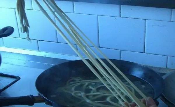 8大火烧开锅里的水,放入处理过的水切面,煮1分钟。.面条控干水分放入碗中。