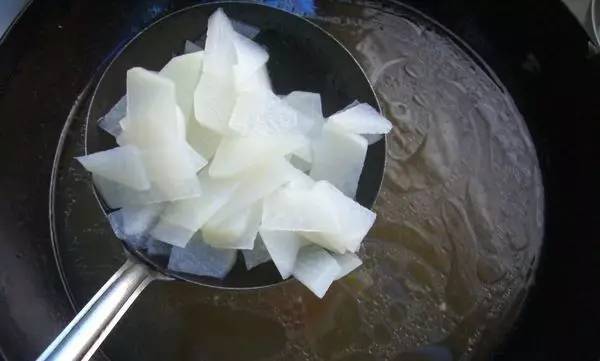 9白萝卜切薄片,加2克食盐开水煮熟,然后换水泡上备用